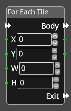 - A node connected to the Body port will be executed in sequence for every tile in the rectangular area.