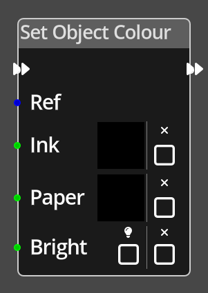 The Set Object Colour Node is a little different to many other nodes in the way it presents parameters, this is due to the fact that it can be used to modify only certain properties of the object colour. The primary difference in the parameters is the inclusion of an additional checkbox for each with a small X above it, this check box is used to indicate that the operation should ignore that property altogether. For example, selecting the X checkbox on the Ink property would ensure that the operation makes no changes at all to the ink colour of the object.