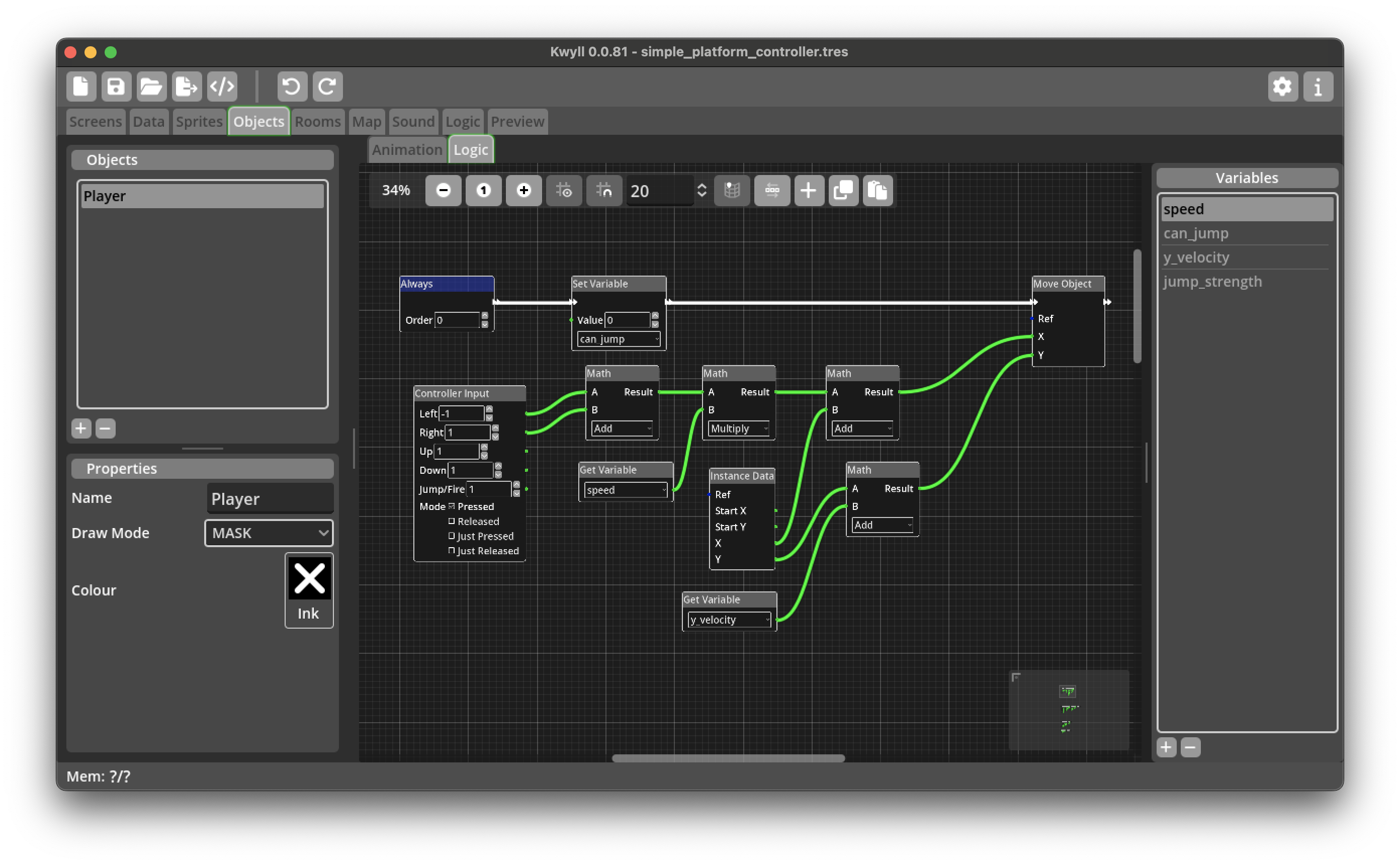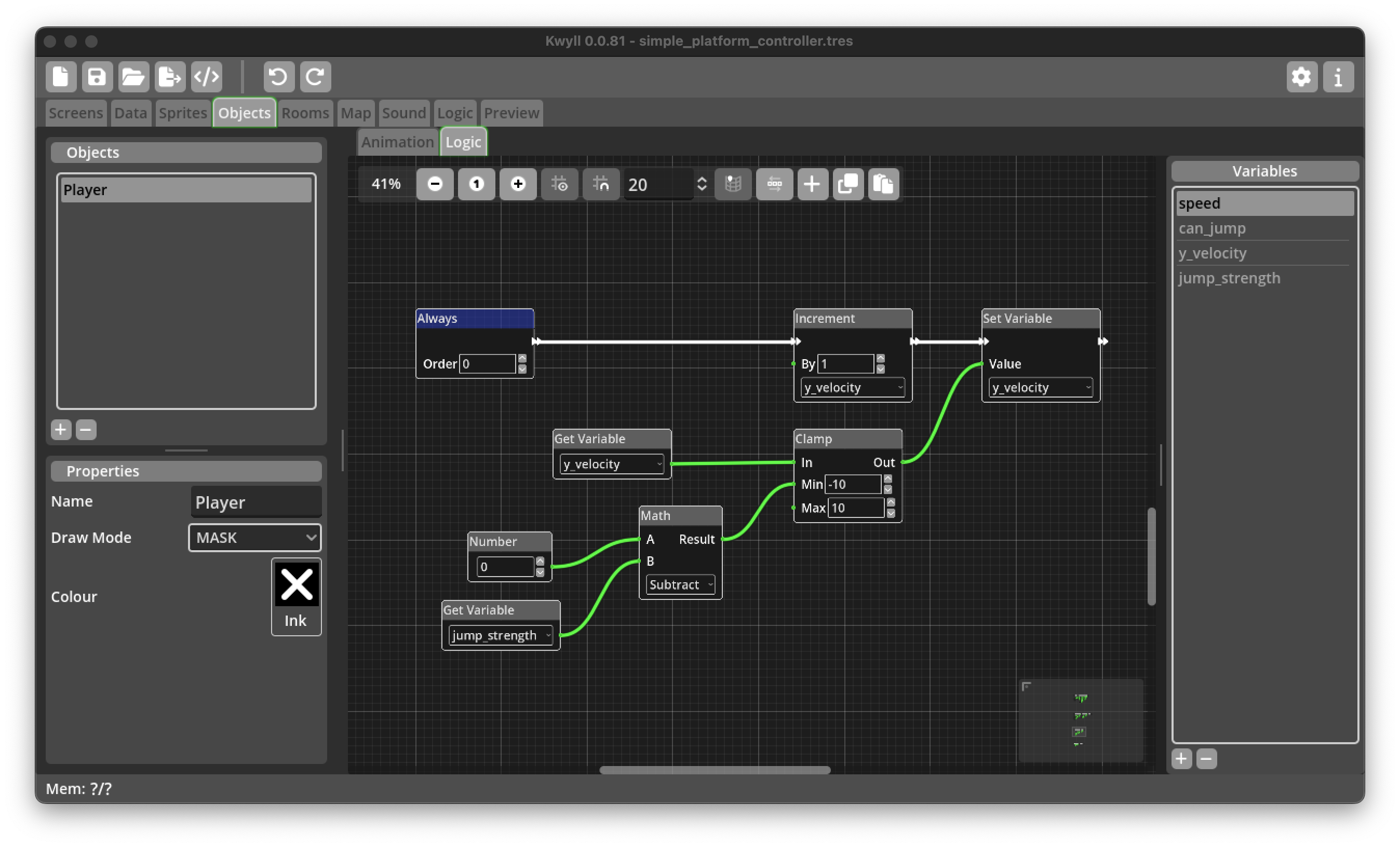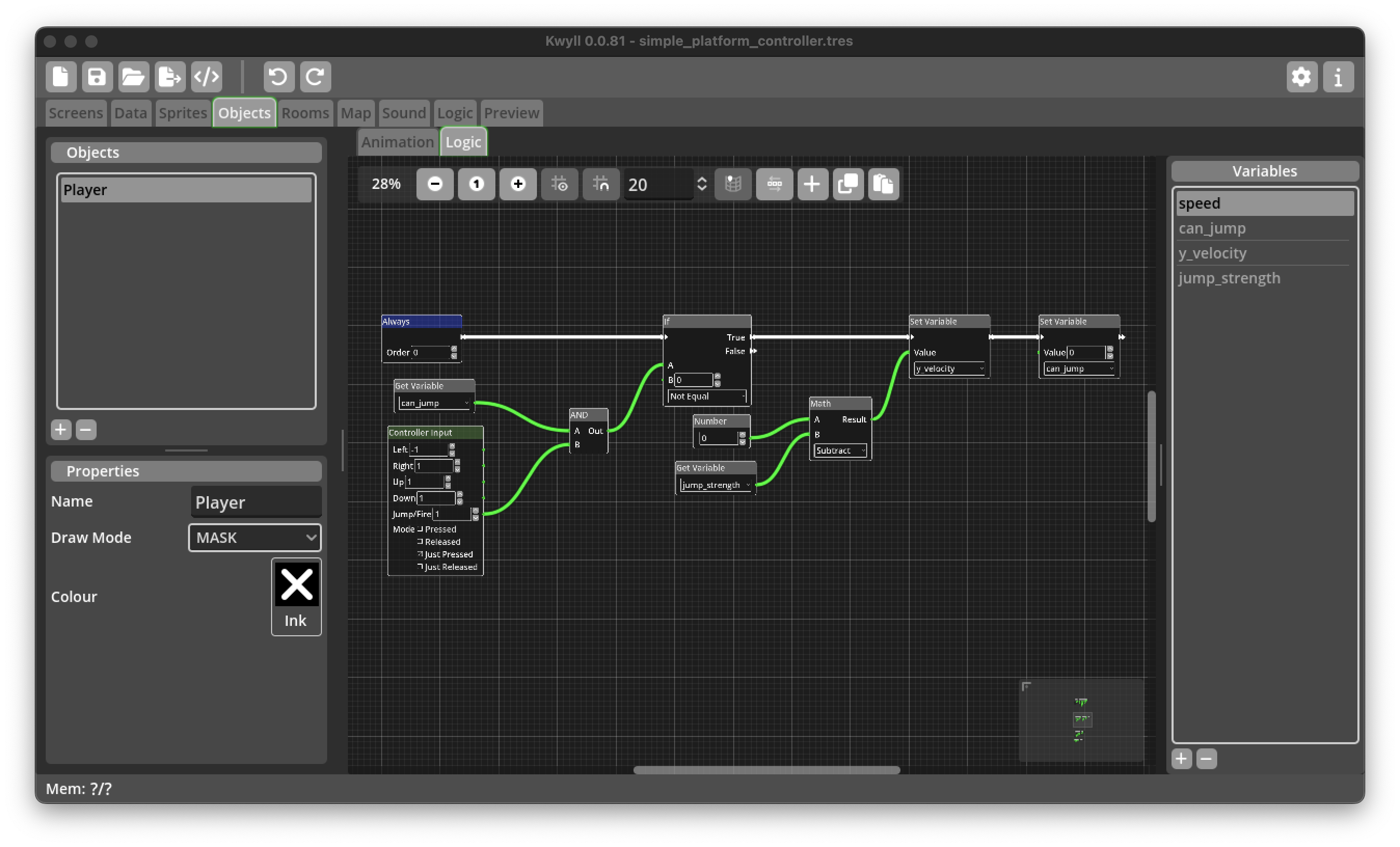 One of the most common game genres for retro computers is the platformer, a game where the player typically has controls to move left and right, and to jump onto platforms and fall down when walking off a platform. This tutorial guides you through creating the logic nodes to create a player object in this style. While this very likely won't be adequate for a fully fledged game it should give some insights into some of the techniques that Kwyll offers to do this and serve as a starting point for customisation and improvement.