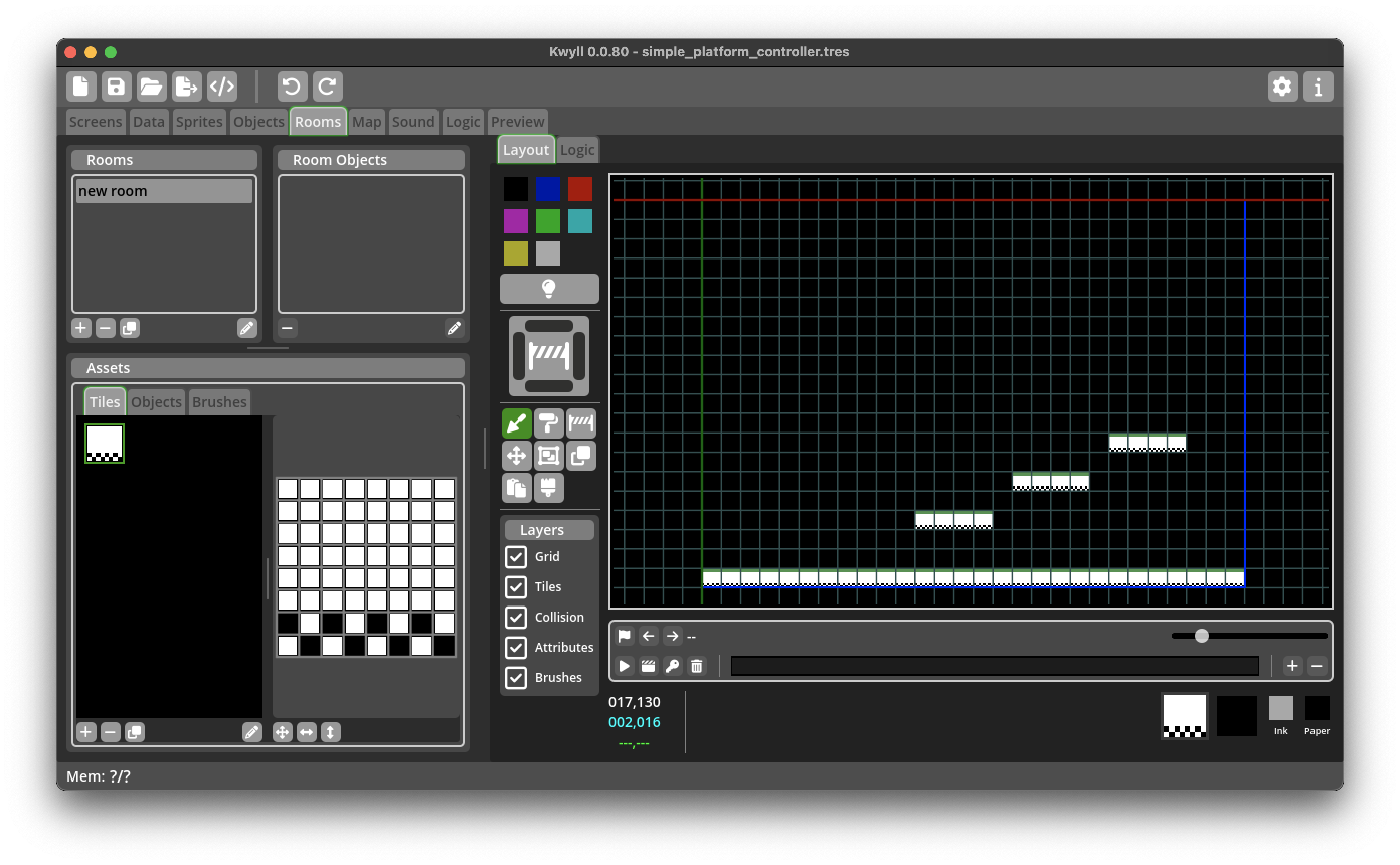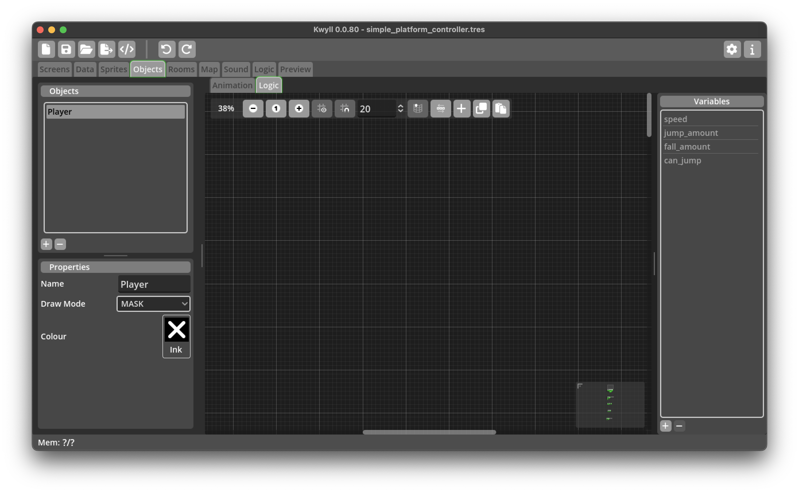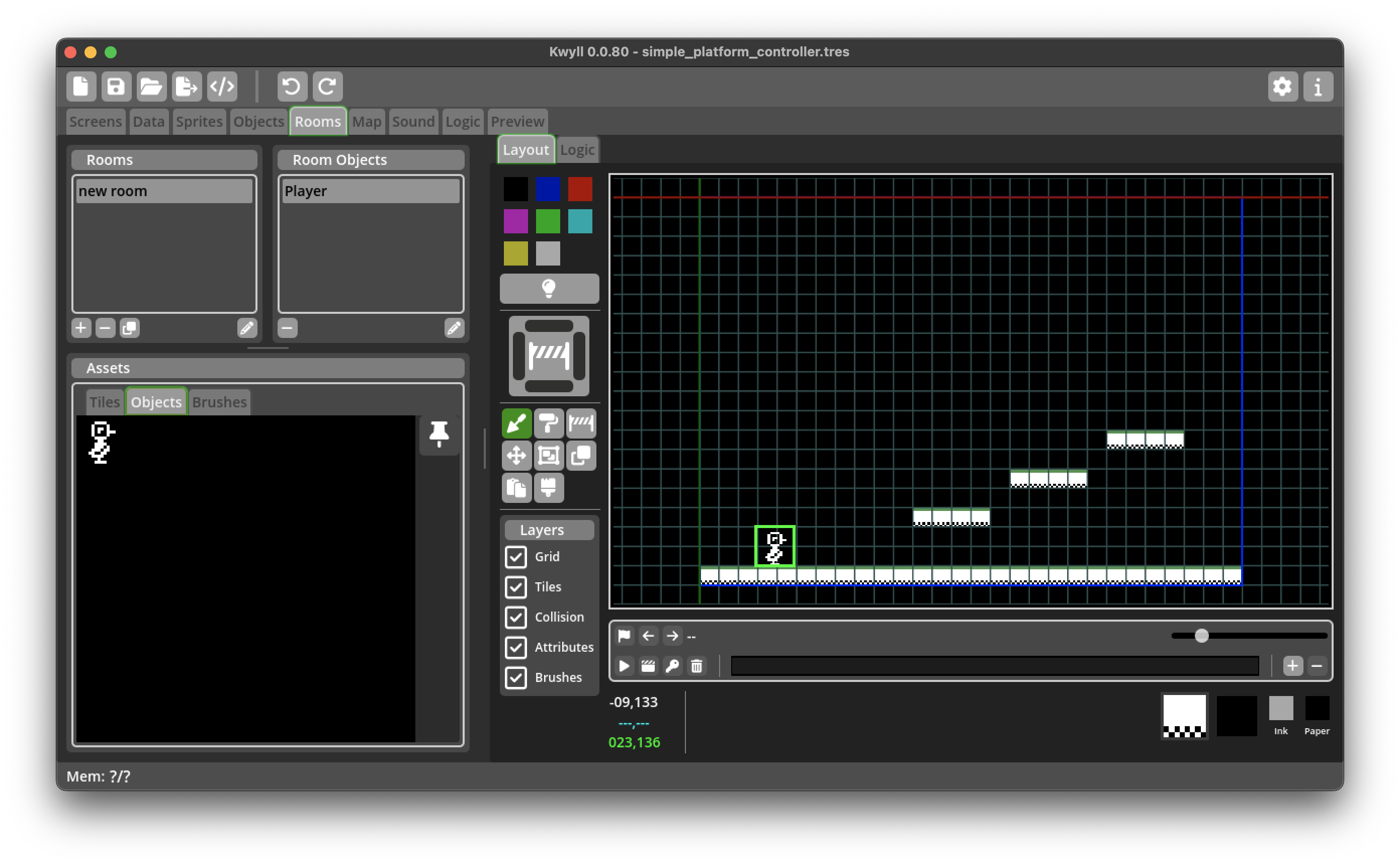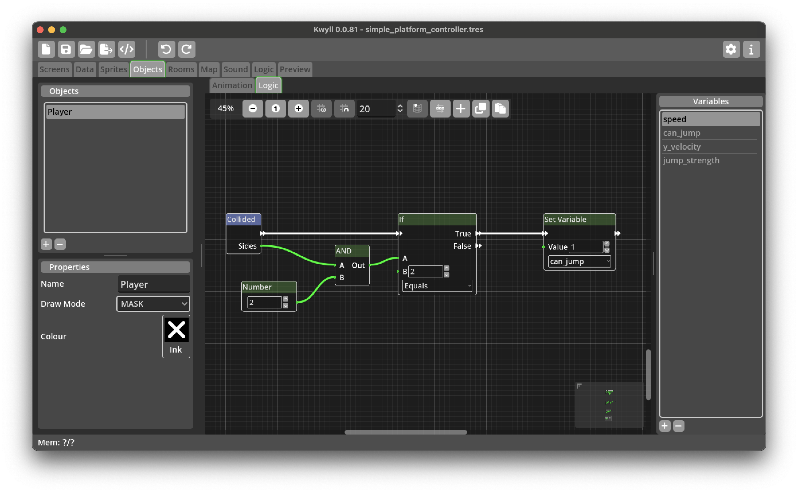 One of the most common game genres for retro computers is the platformer, a game where the player typically has controls to move left and right, and to jump onto platforms and fall down when walking off a platform. This tutorial guides you through creating the logic nodes to create a player object in this style. While this very likely won't be adequate for a fully fledged game it should give some insights into some of the techniques that Kwyll offers to do this and serve as a starting point for customisation and improvement.