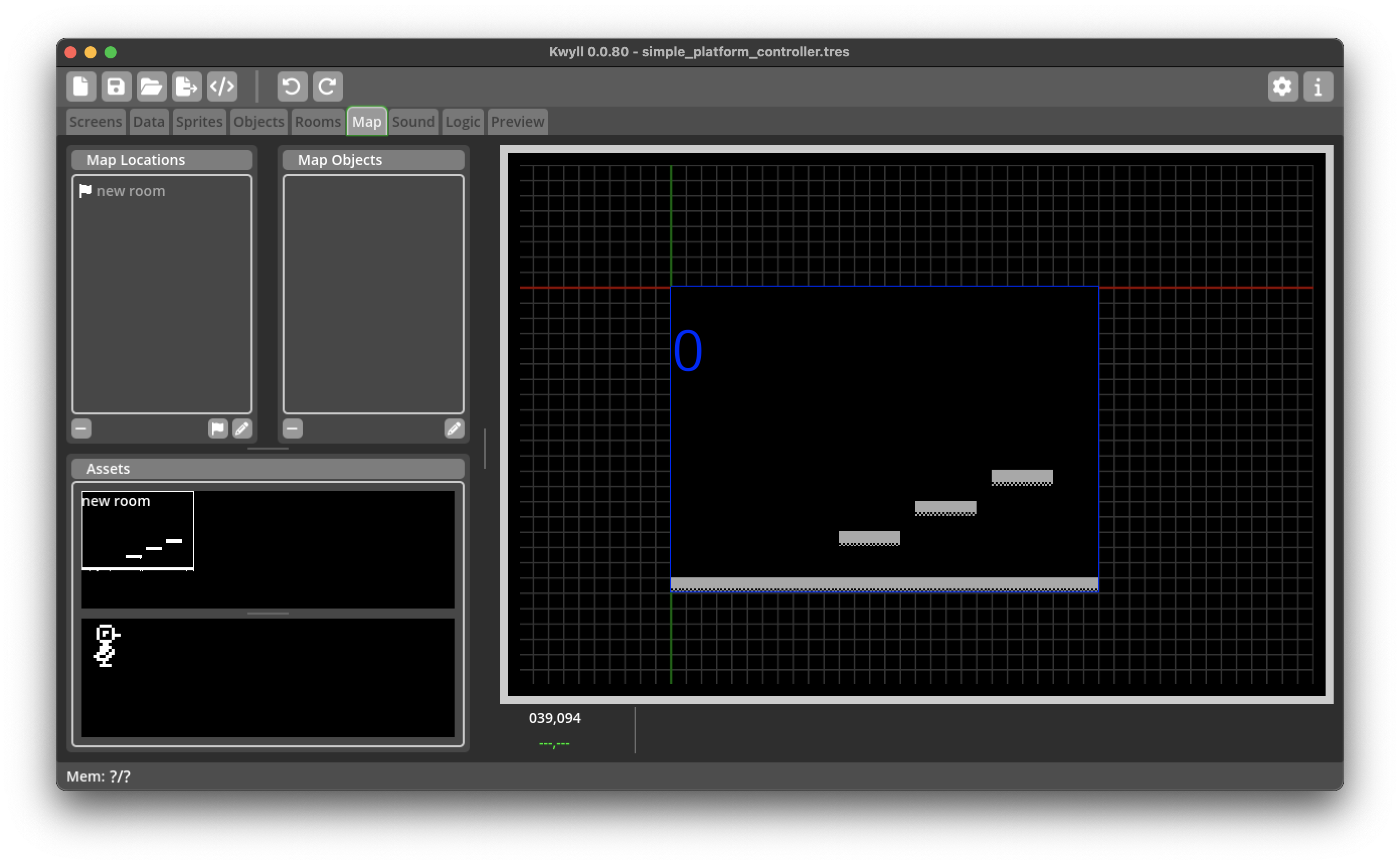 Drag the Player object from the objects panel onto the room. Note: normally the player would be a "Map" object, which allows it to travel between rooms, but for the purposes of this tutorial, we'll just have a single room, so we can just place our player in the room directly.