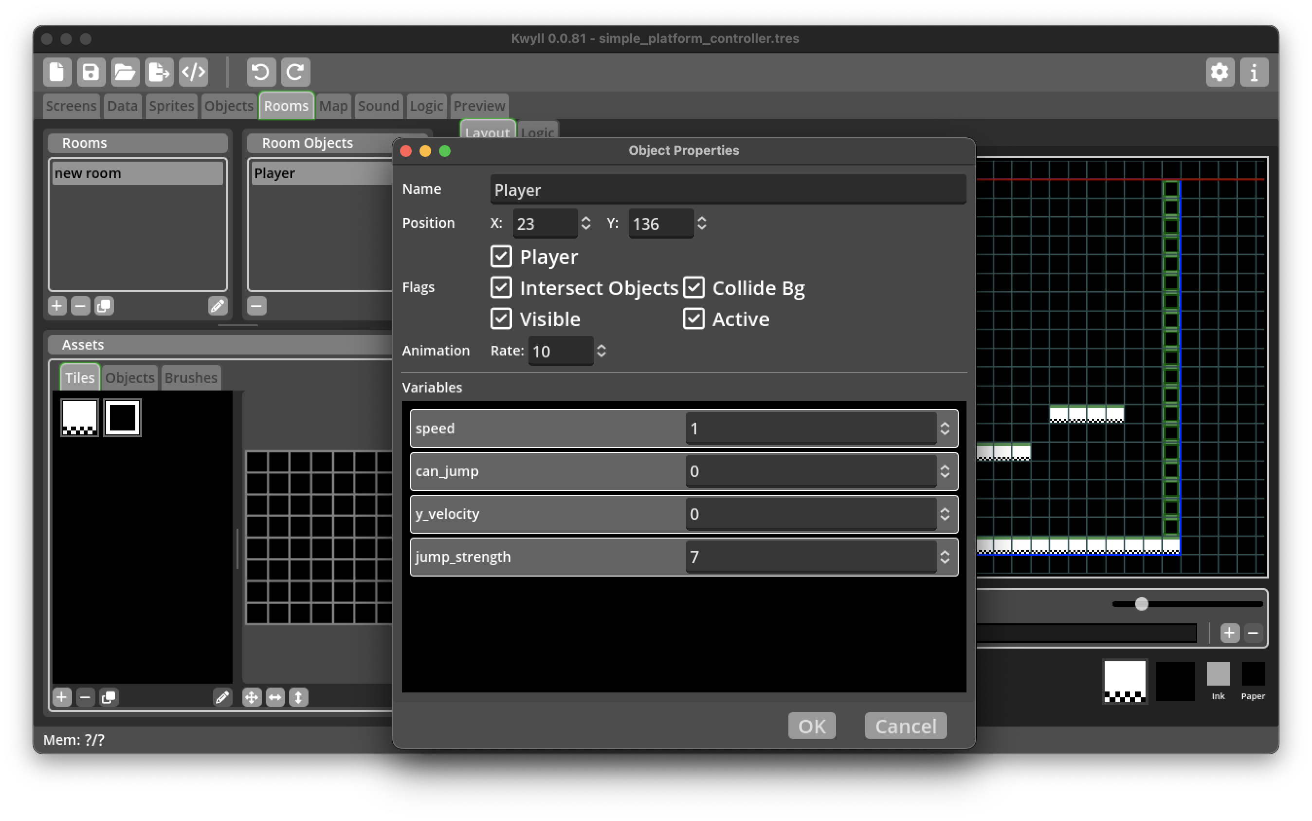 In the Variables section of the object properties, you'll need to set the values of "speed" and "jump_strength" to suitable values, 1 and 7 will be good for our example, but you can tweak those as you choose.