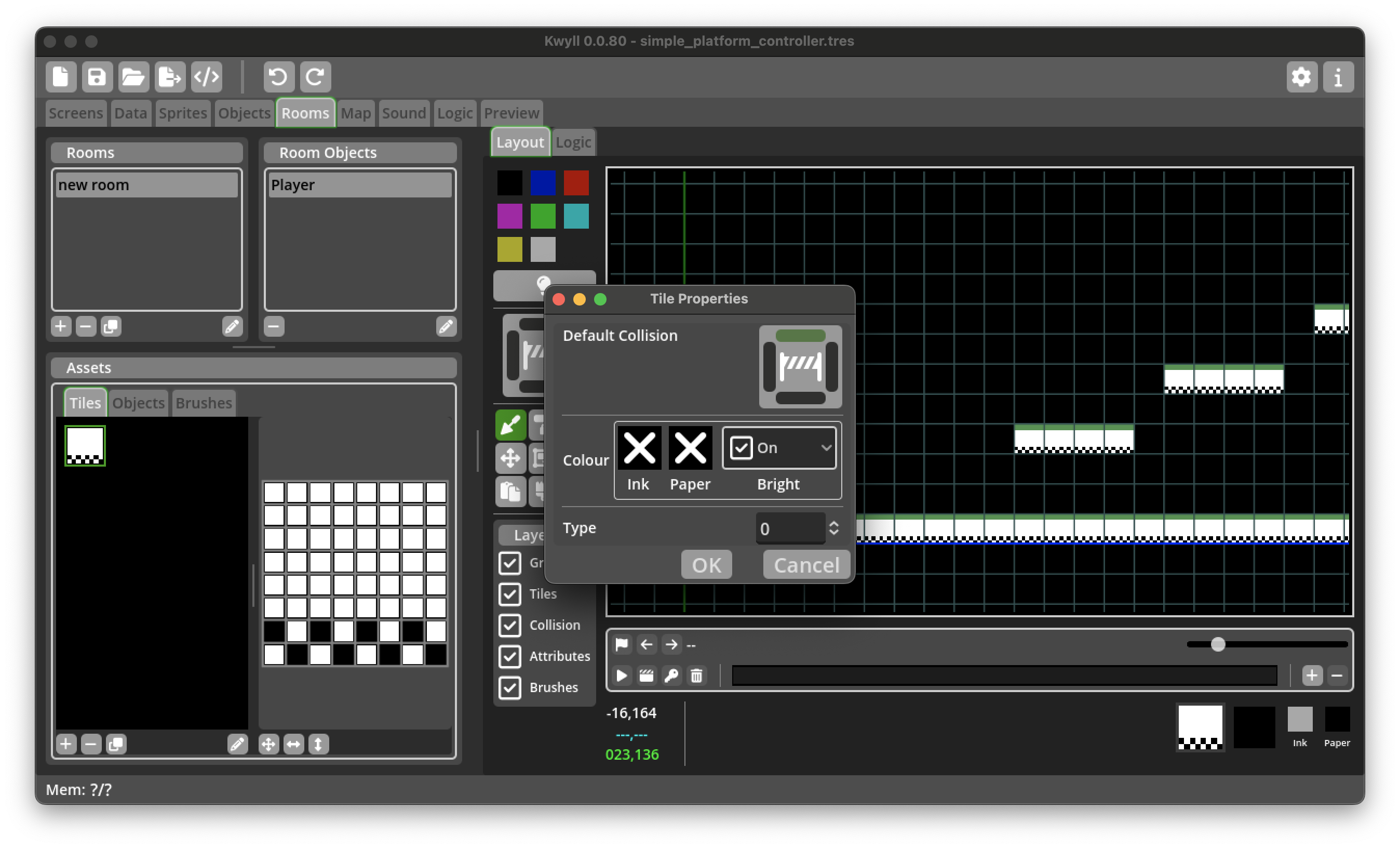 Back in the Room Editor, open the object properties dialog for the player and make sure the "Collide Bg" flag is set so that the player object will collide with our platform tiles.